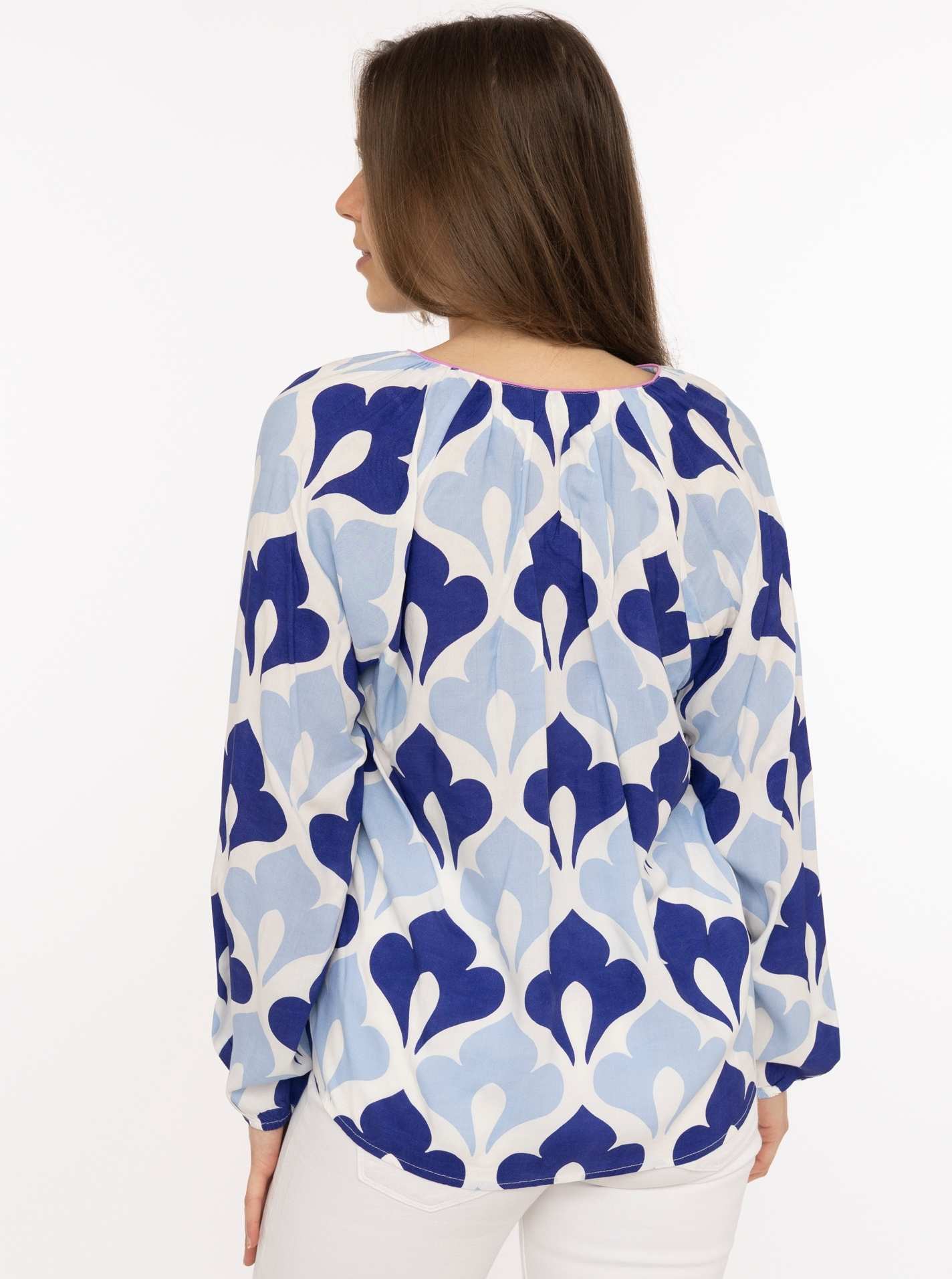 Die Bluse "Graphic Flower" besticht durch ein grafisches Blumenmuster und eine leicht lockere Passform. Das Material sorgt für ein angenehmes Tragegefühl und einen schönen Fall.