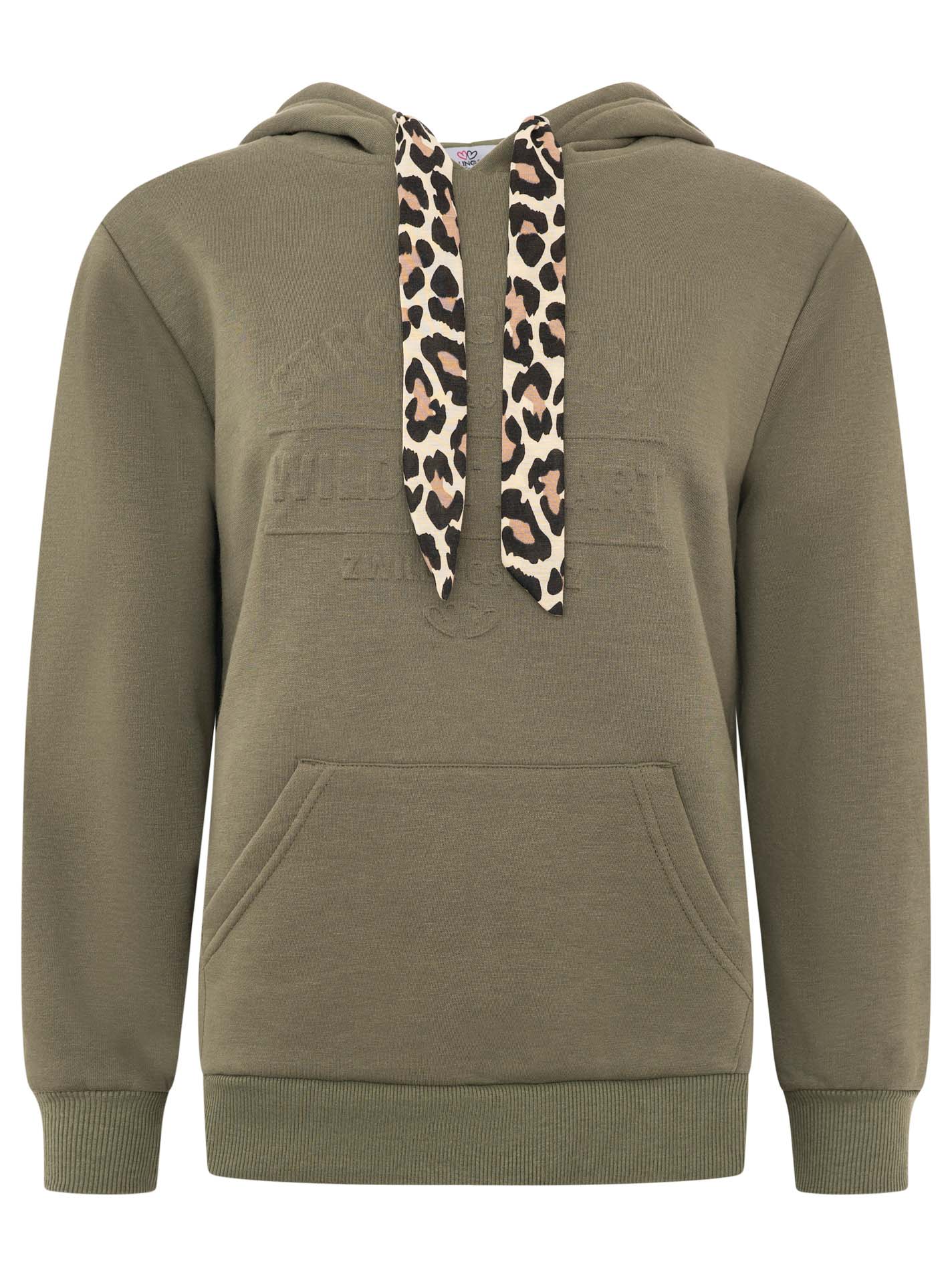Der Hoodie "Strong Soul" überzeugt mit einem geraden Schnitt und komfortabler Passform sowie einer praktischen Kängurutasche. Der Kordelzug in Leopardenoptik verleiht dem Modell eine stylische Note.