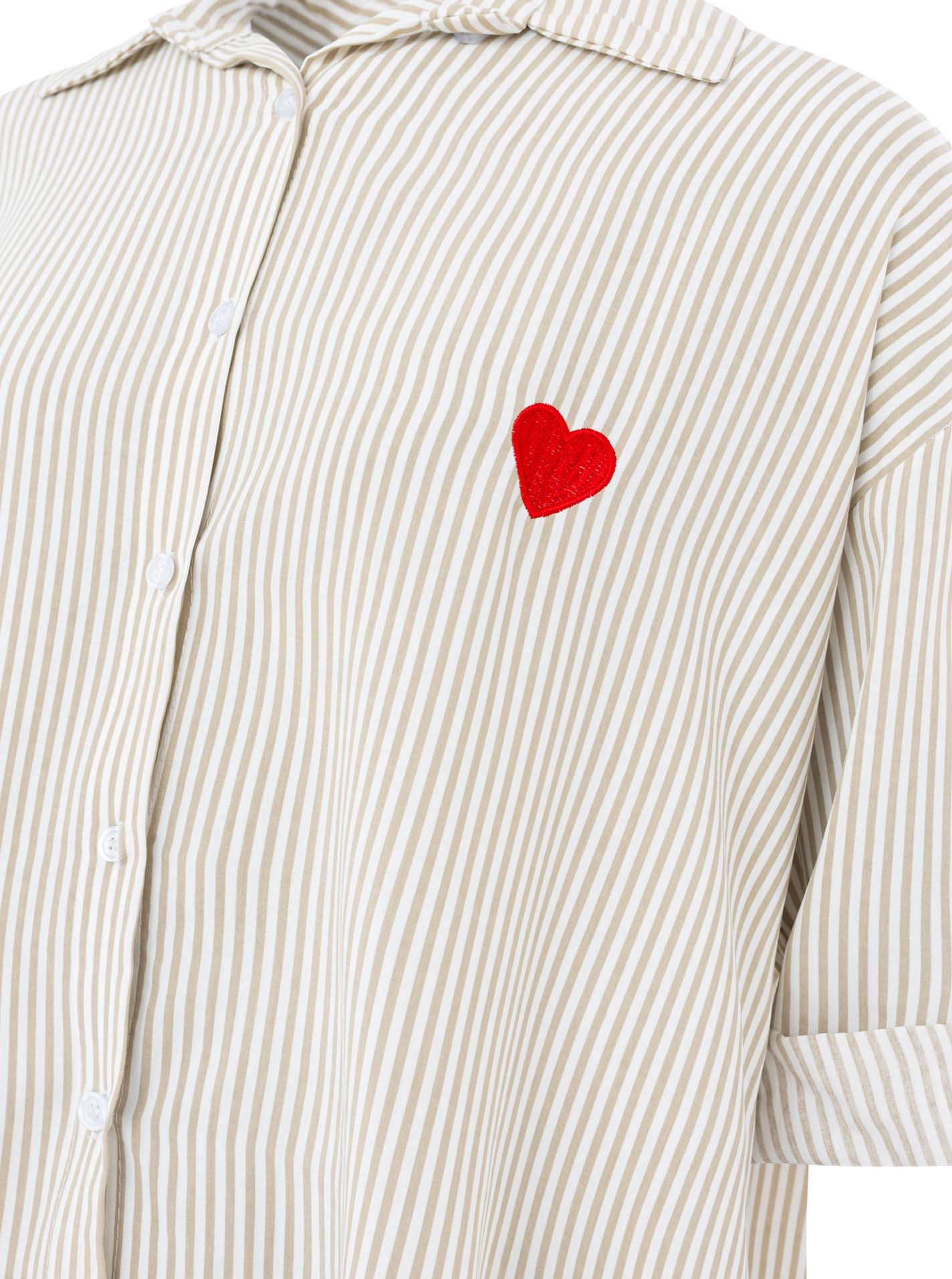 Die Oversize Bluse „Streifen & Herz“ besteht aus leichtem, angenehm zu tragendem Material und bietet eine lockere, bequeme Passform. Das Streifenmuster kombiniert mit dezenten Herz-Details sorgt für einen modernen, femininen Look- aus 100% Baumwolle