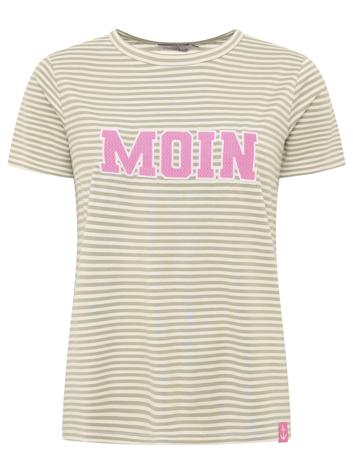 Das T-Shirt "Anker Moin" überzeugt mit einem klassischen Streifenmuster und einem maritimen Ankerdetail. Das weiche Material und der gerade Schnitt sorgen für angenehmen Tragekomfort und einen klaren Look.